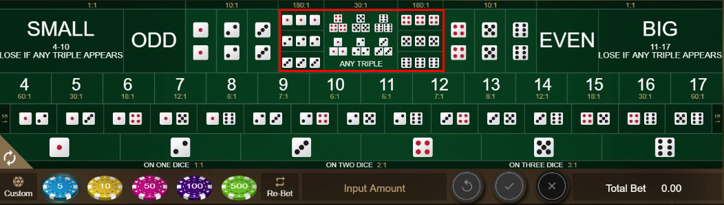 This last payout is very different from a winning Triple bet (see above, which pays 150 to 1. But these different betting options are what make Sic Bo so fascinating!